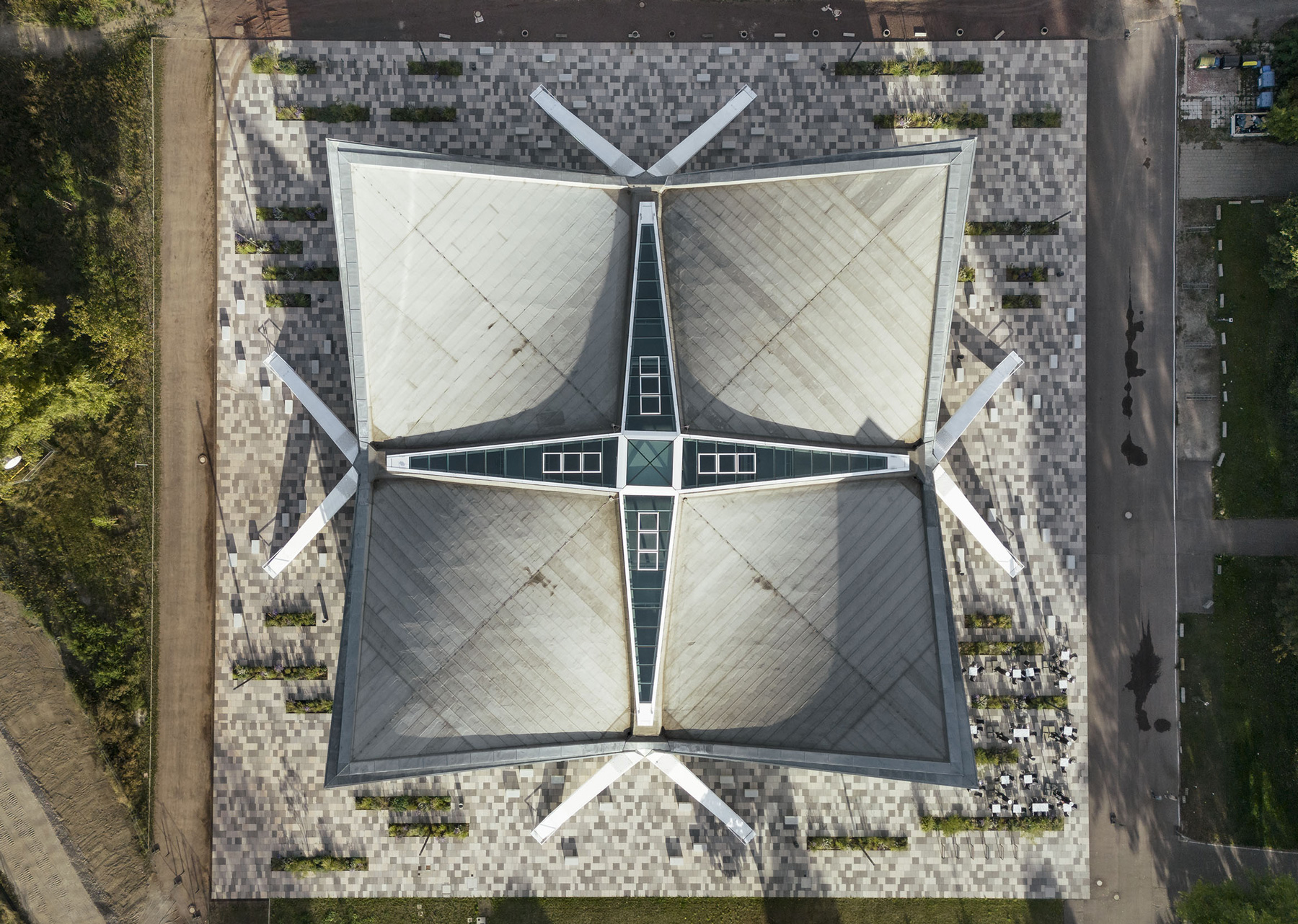 Architektonisch hebt sich das in den 60er Jahren entstandene Gebäude vor allem durch seine Kubatur und die leichte Baukonstruktion aus Beton und Glas hervor. Eingebunden zwischen baumbestandenen Wiesenflächen im Norden und Westen des Gebäudes, der langen repräsentativen Promenade, mit ihren wegebegleitenden Retentionsbecken im Osten und der Eventplaza mit der angeschlossenen Stadthalle im Süden, entsteht ein vielseitiges und stimmiges Gesamtensemble.