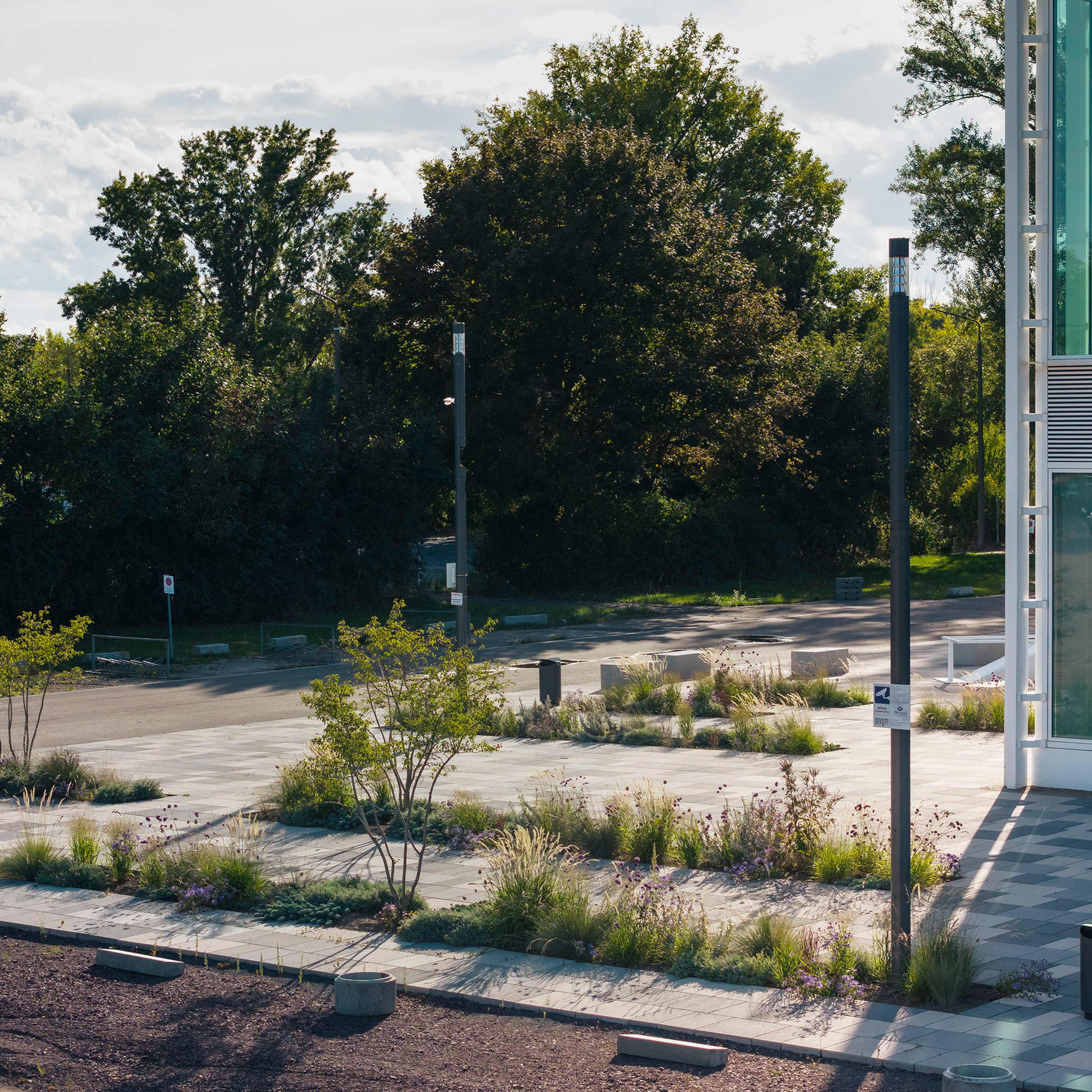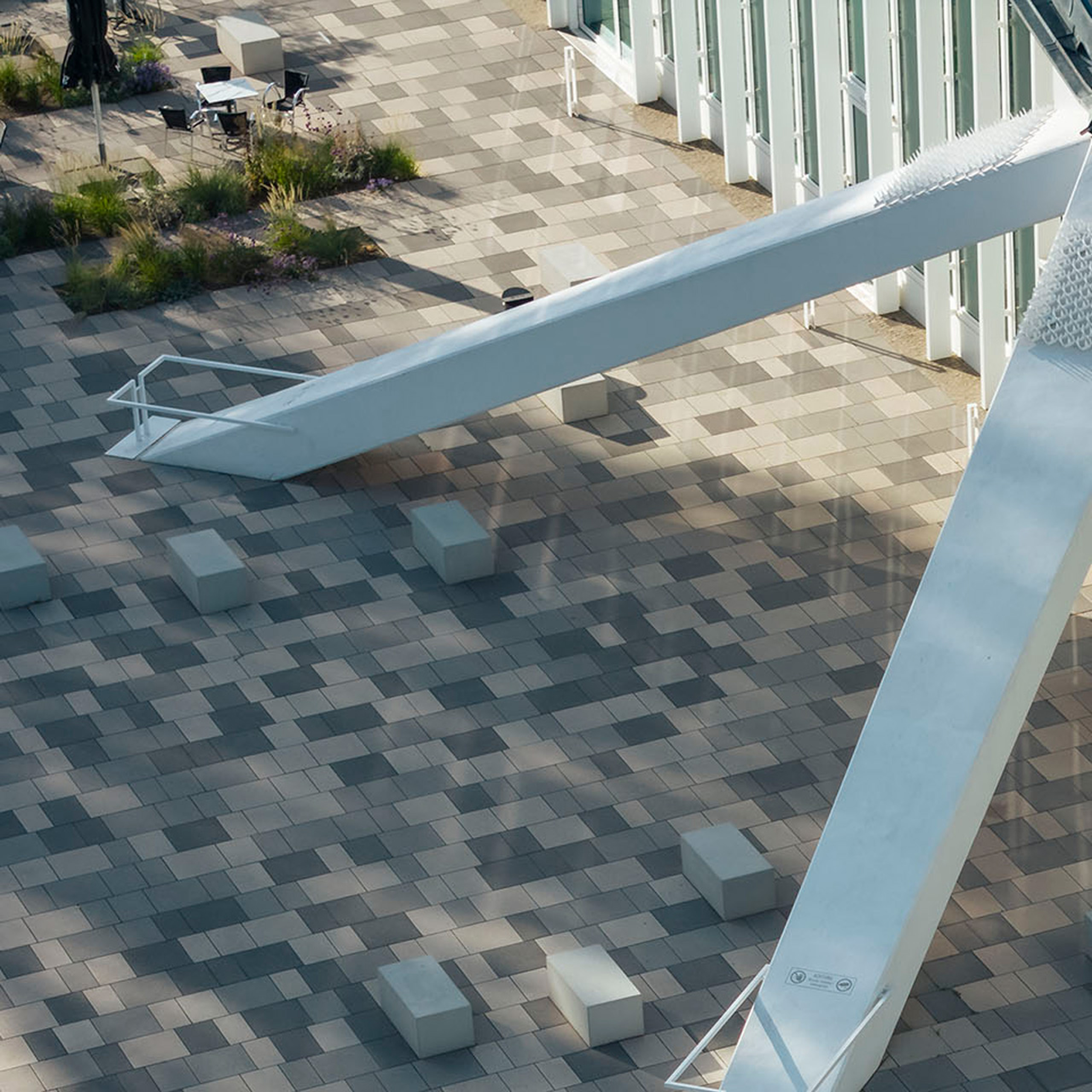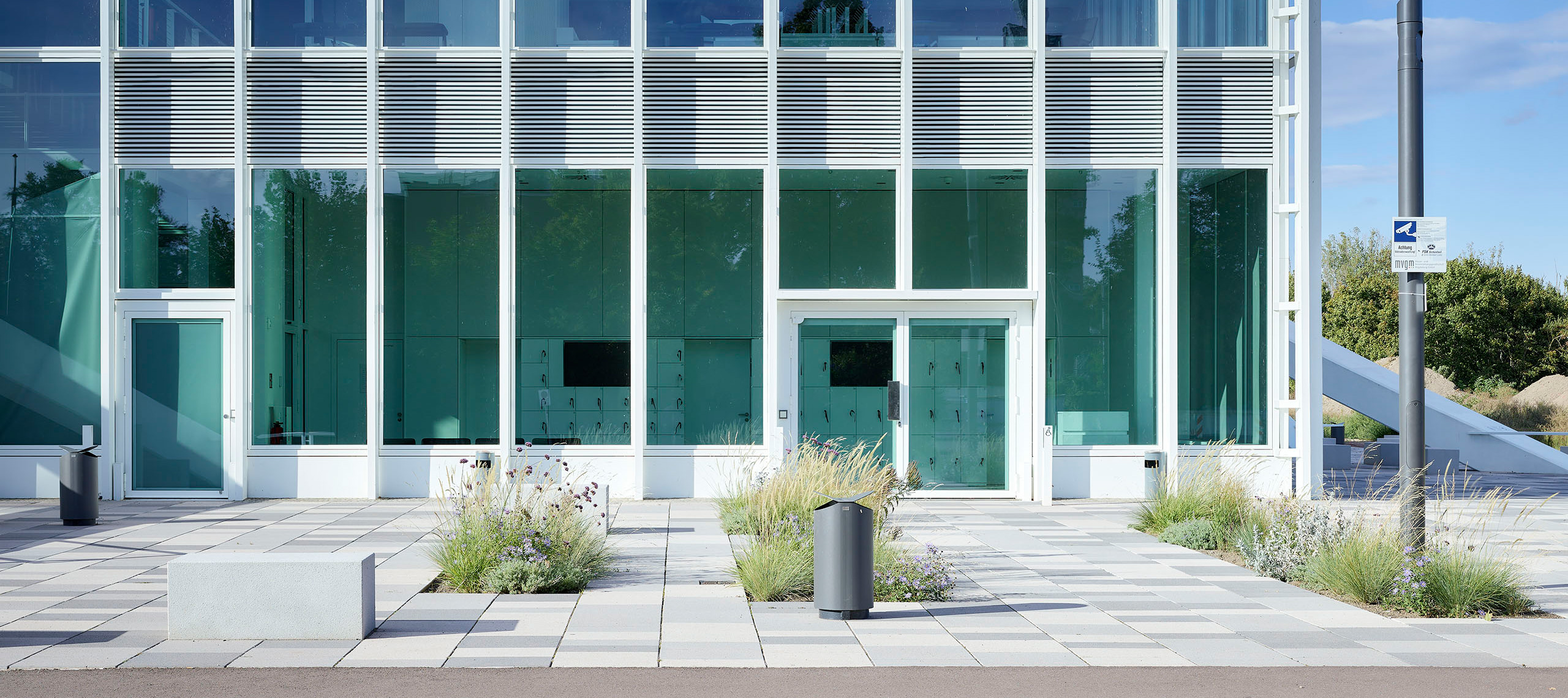 Der Umgriff der Hyparschale nimmt hierzu die quadratische Grundform des Gebäudes auf und betont die Sonderwirkung als Abschluss der „Kette“. Die freiliegenden Tragwerkselemente aus Beton versinken zwischen den Platten im Boden, während sich Grüne Inseln in Ausrichtung des Plattenbelages und Betonblöcke aus dem Boden erheben. Sie lockern das Gesamtbild der Fläche auf und schaffen transparente und kompakte Rückzugsräume für Besuchende und Personal. Die Grüninseln sind mit leichten Gräsern, Kräutern und trockenheitsliebenden Stauden bepflanzt, welche durch eine graue Mineralschotterung die Leichtigkeit der Architektur unterstützen. Ergänzt werden die Grünstreifen durch schirmförmige Amelanchier lamarckii, die sich als leichte Farbtupfer auf dem Platz verteilen. Die locker an den Eingängen verstreuten Betonblöcke laden zum Sitzen, Rasten und Studieren von Architektur, Mensch und Umfeld ein.