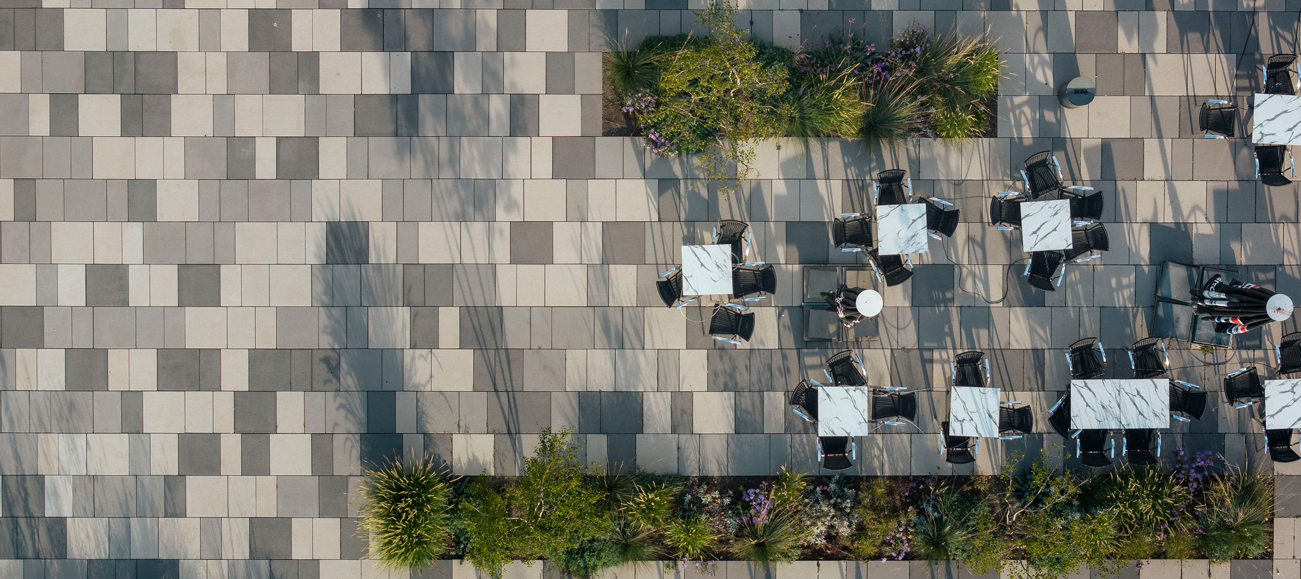 Mit dem Ziel einen langlebigen und nachhaltig nutzbaren Raum zu schaffen, wurde die sich aus dem denkmalpflegerischen Kontext ergebende Betonfläche mit einem repräsentativen Charakter, alltagstauglicher Aufenthaltsqualität und einem zeitgemäßen Regenwassermanagement versehen. Eine lebendige, klimaresiliente und trockenheitsangepasste Pflanzenauswahl ergänzt diesen Ansatz.