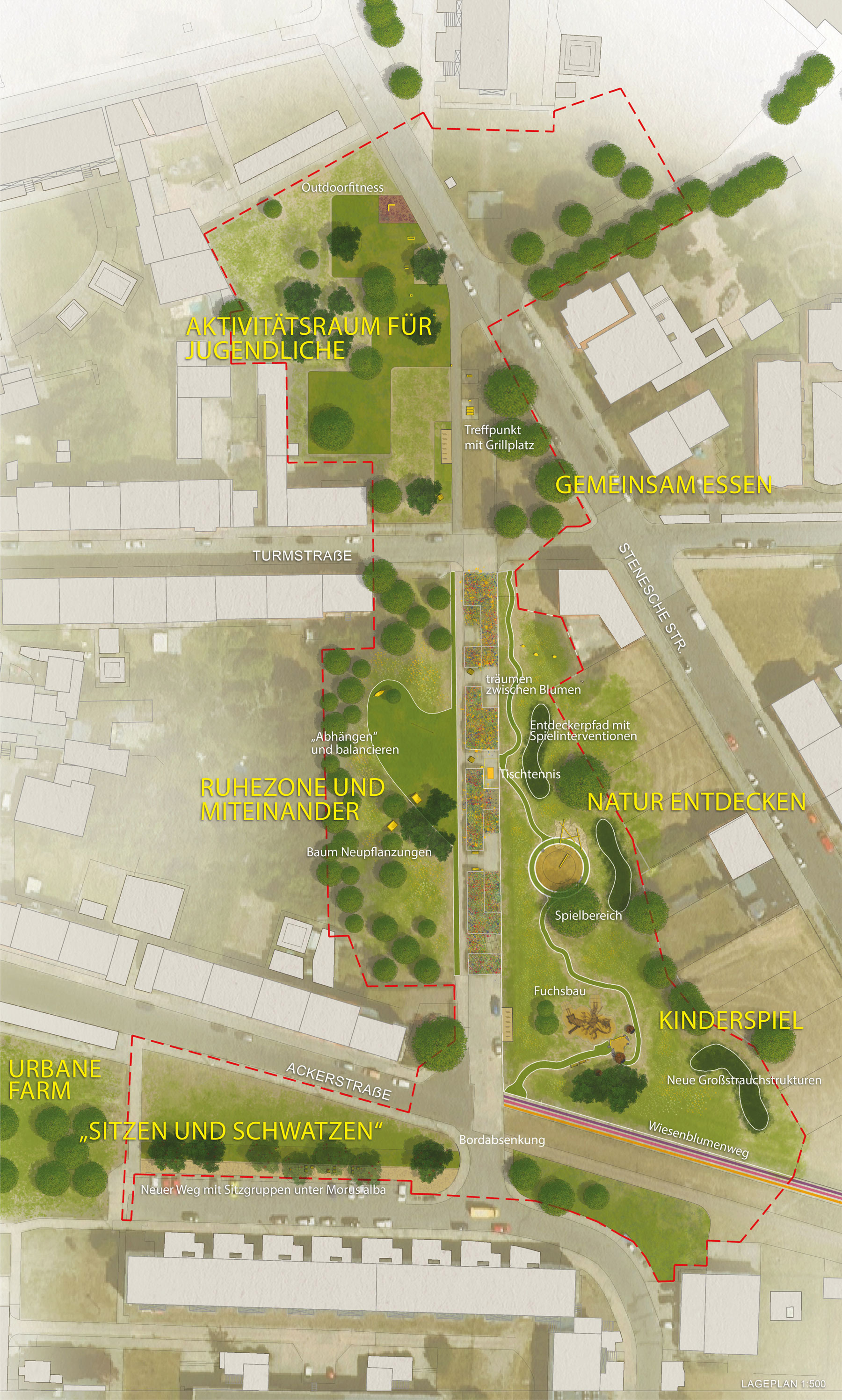 Mit der Umsetzung des Spielplatzes „Fuchsbau“ (3.500qm) gelang der erste Schritt zur Identifikation der Bewohner:innen mit ihrem Nachbarschaftspark. Das gesamte Planungsgebiet umfasst einen Gesamtraum von ca. 20.500qm. Im zweiten Schritt entstanden im Freiraum zwischen Ackerstraße und Turmstraße im Sinne eines Nachbarschaftsparks generationenübergreifende Nutzungsangebote. Es zeichnen sich Räume für Kinder, Jugendliche und Senior:innen ab. Einfache Eingriffe in das Erschließungssystem wie die Absenkung eines Bordes und ein zusätzlicher Weg im südlichen Planungsgebiet unterstützen deren Erreichbarkeit und erhöhen die Mobilität der Senior:innen im Quartier.