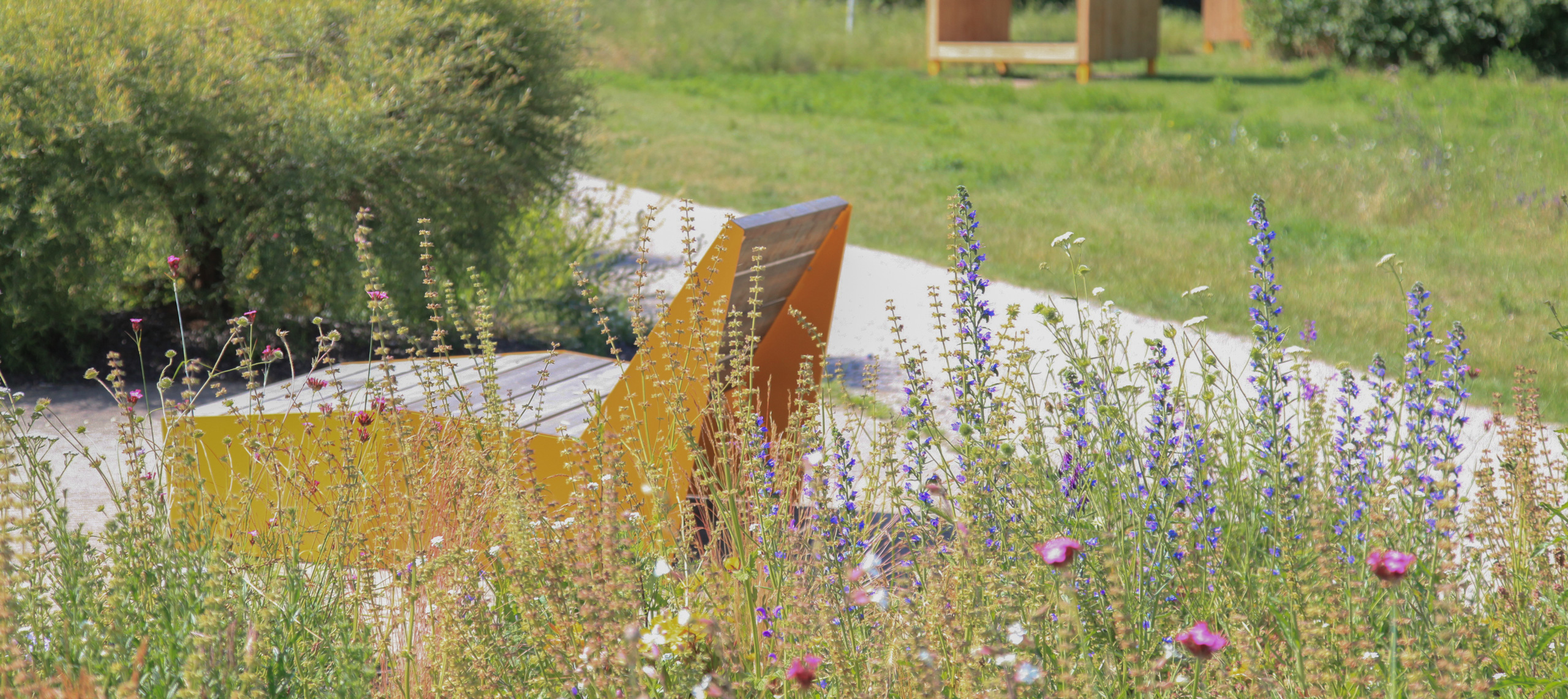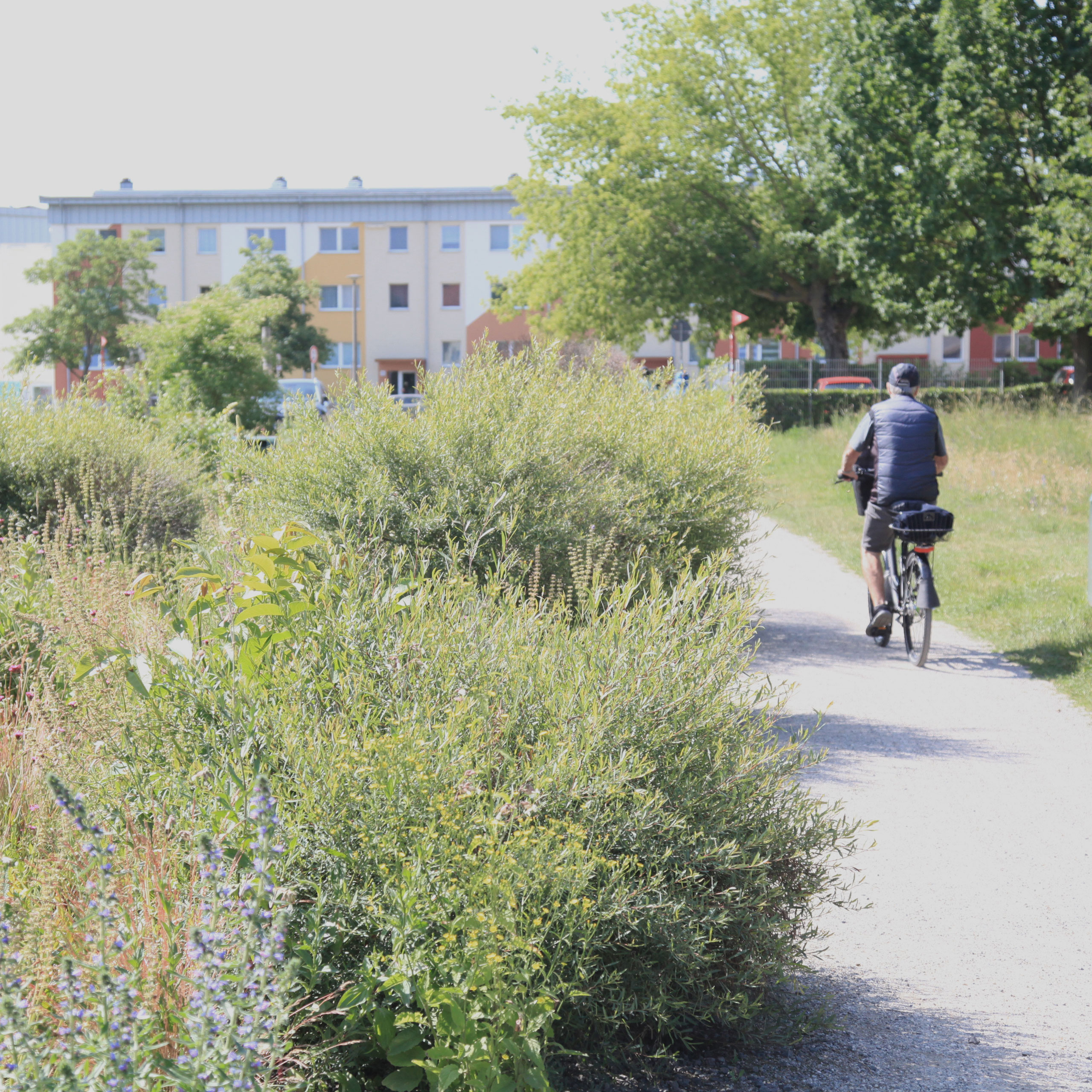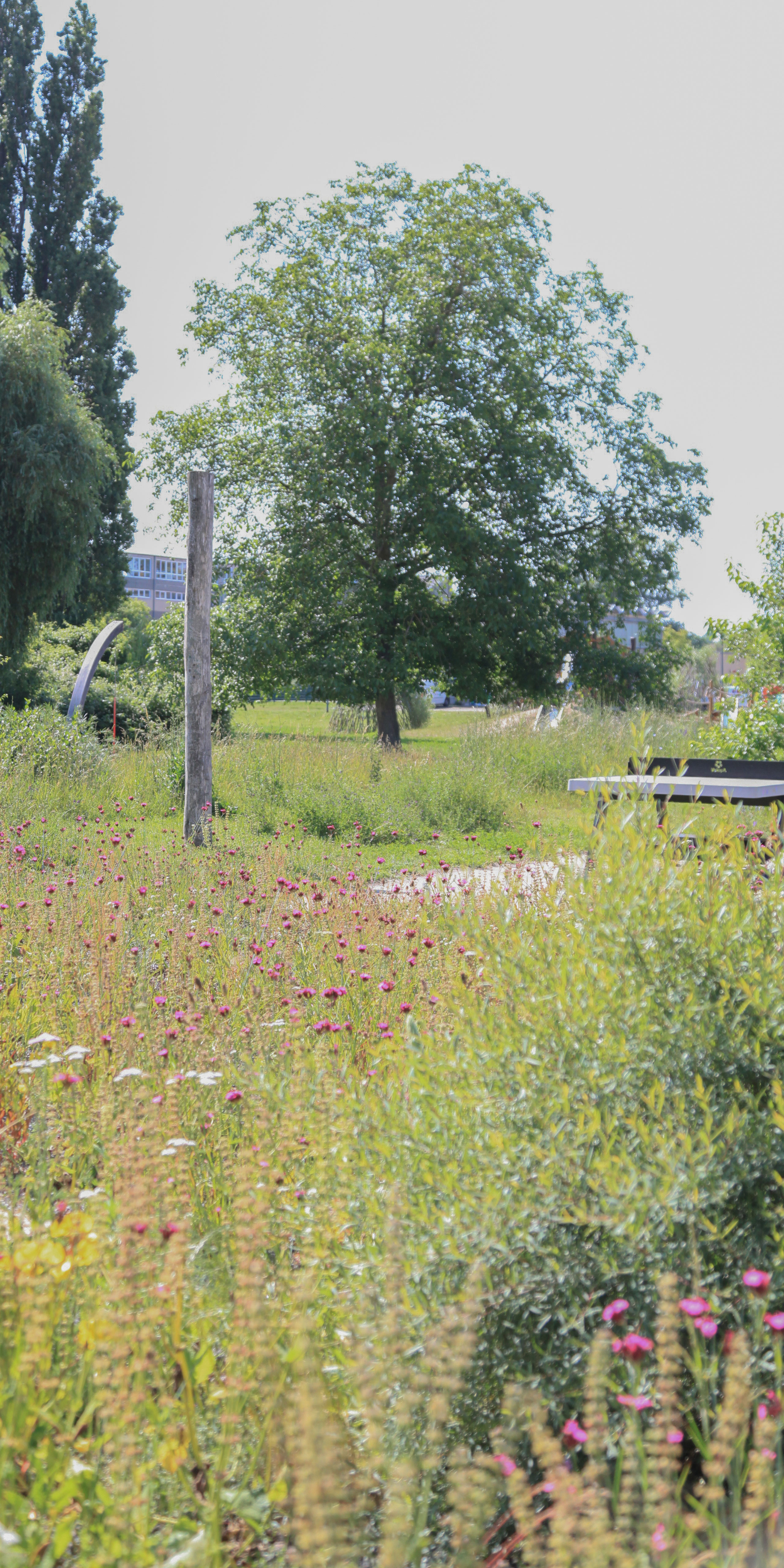 Mit der Gestaltung der Flächen wird eine vielfältige, nachhaltige und klimaangepasste Freiraumnutzung sichergestellt, deren Qualifizierung im Wesentlichen über Pflanzungen, neue Baumstandorte, die Einordnung von Ausstattungselementen und kleinere Wegebauarbeiten im Süden des Geländes erfolgt. Anknüpfend an die Gestaltungselemente aus dem Rückbau der Gartenstraße wurden Baumgruppen als Sichtmarken sowie Gehölze in den Randbereichen angepflanzt.