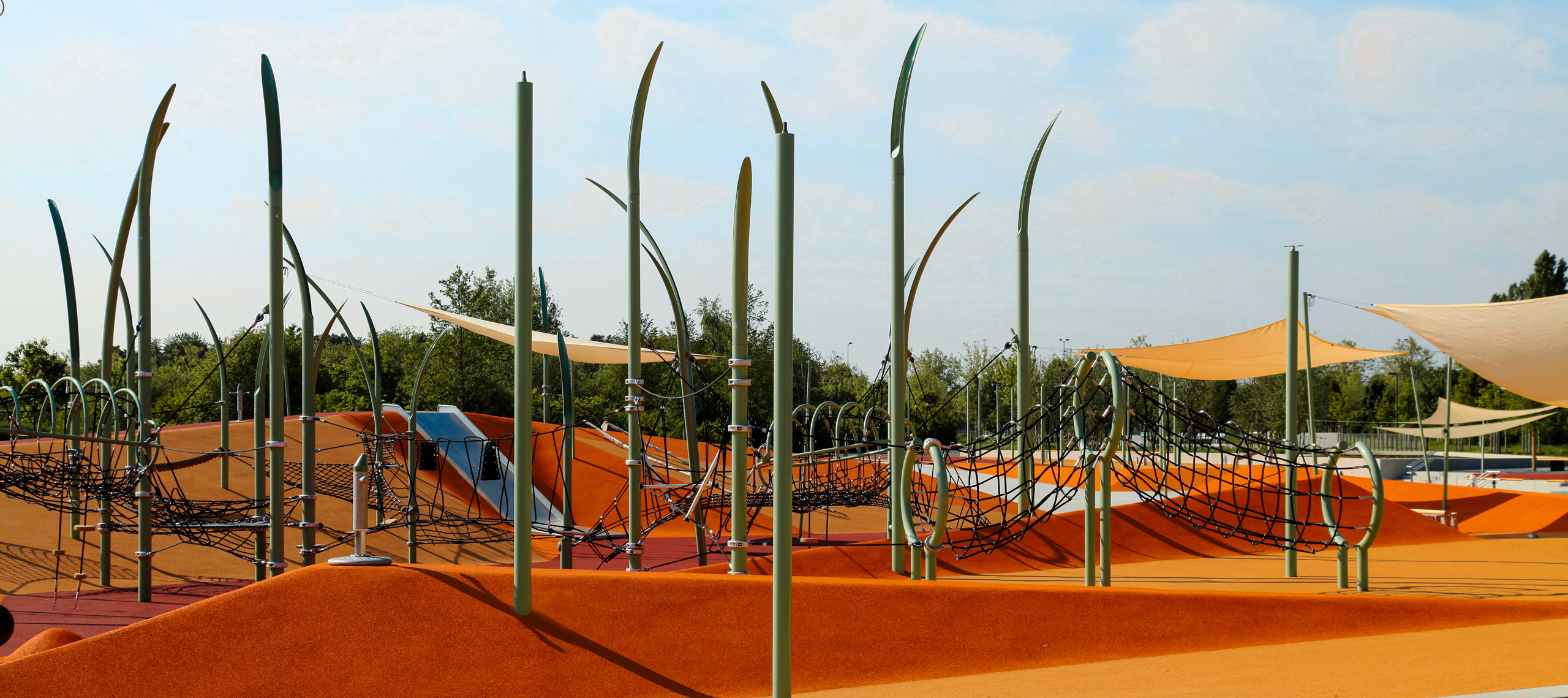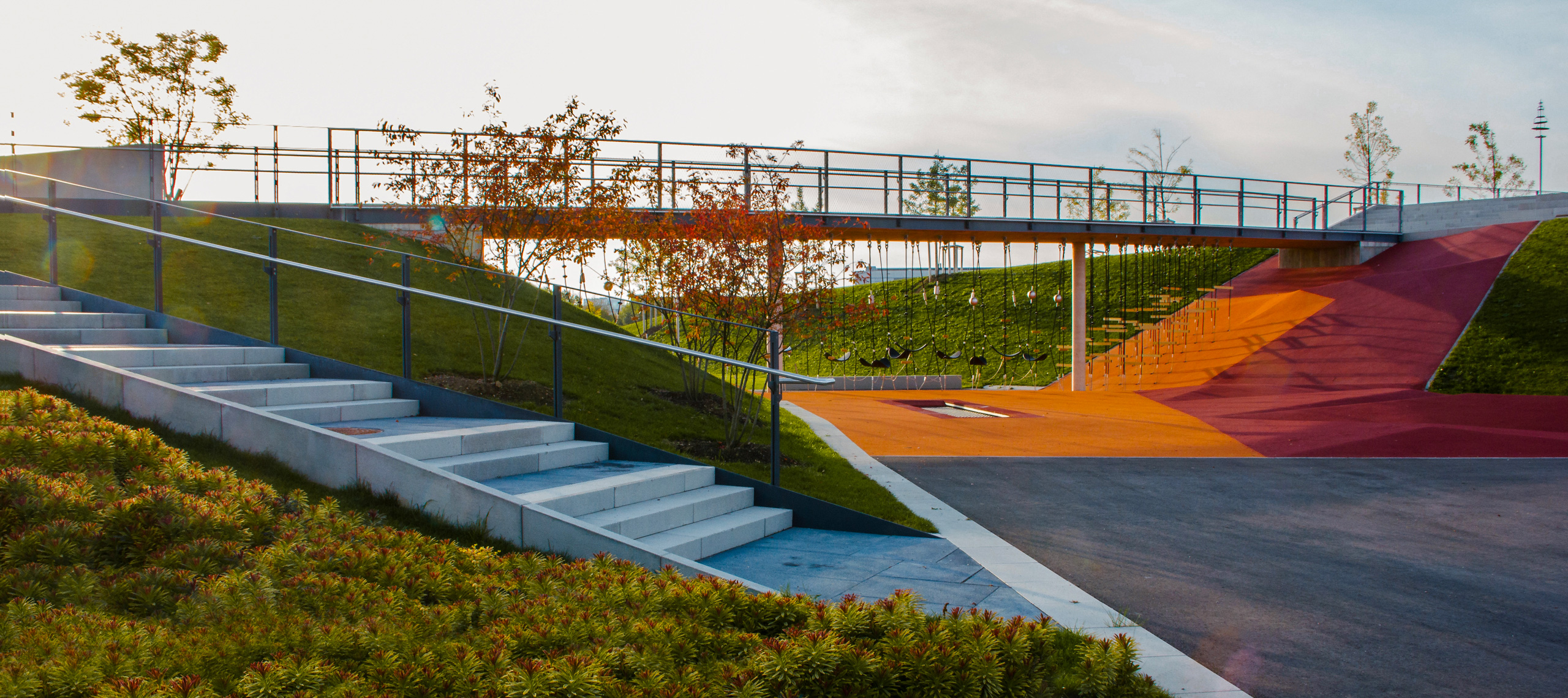 Ein zentrales Element ist die Landmarke im Norden – zwei modellierte Hügel, verbunden durch einen Steg, bilden einen topografischen Höhepunkt und bieten Orientierung im großmaßstäblichen Umfeld. Darunter entfaltet sich ein inklusiver Spielbereich mit hohem Erlebniswert: barrierefreie Trampoline, Kletterseile, Klangobjekte und taktile Elemente laden Kinder mit und ohne Handicap zum gemeinsamen Entdecken ein. Die Gestaltung verbindet Inklusion mit ästhetischer Qualität und räumlicher Dramaturgie.