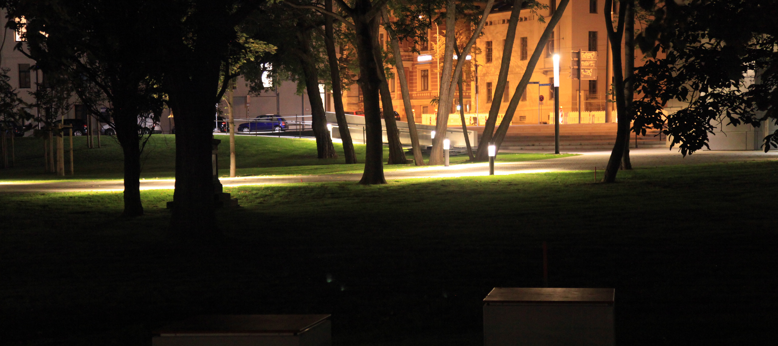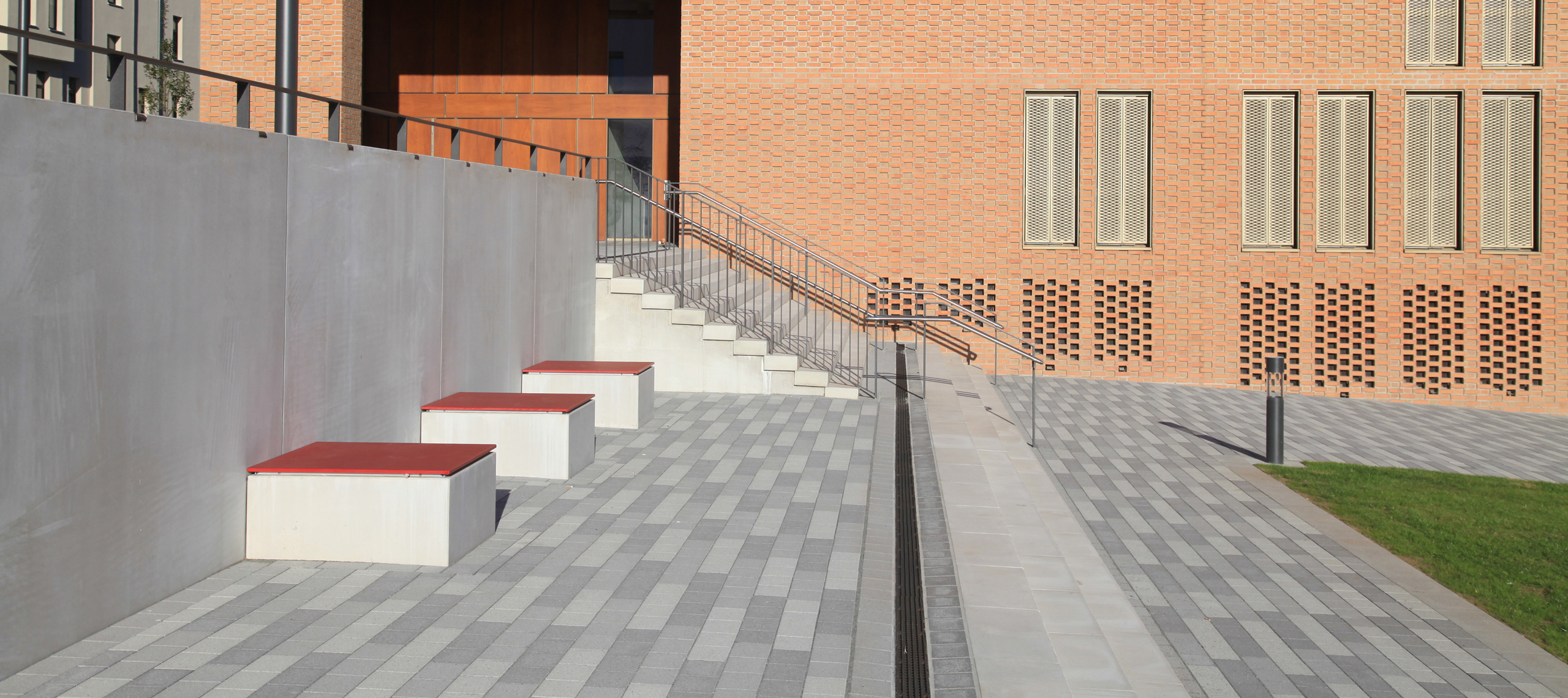 Die Freianlagen des neu entstandenen Campus sind durch befestigte Flächen mit Wegeverbindungen und Plätzen, Treppen- und Rampenanlagen sowie großzügige Grünanlagen mit geneigten Rasenflächen, Baumdächern und dem erweiterten Park gekennzeichnet.