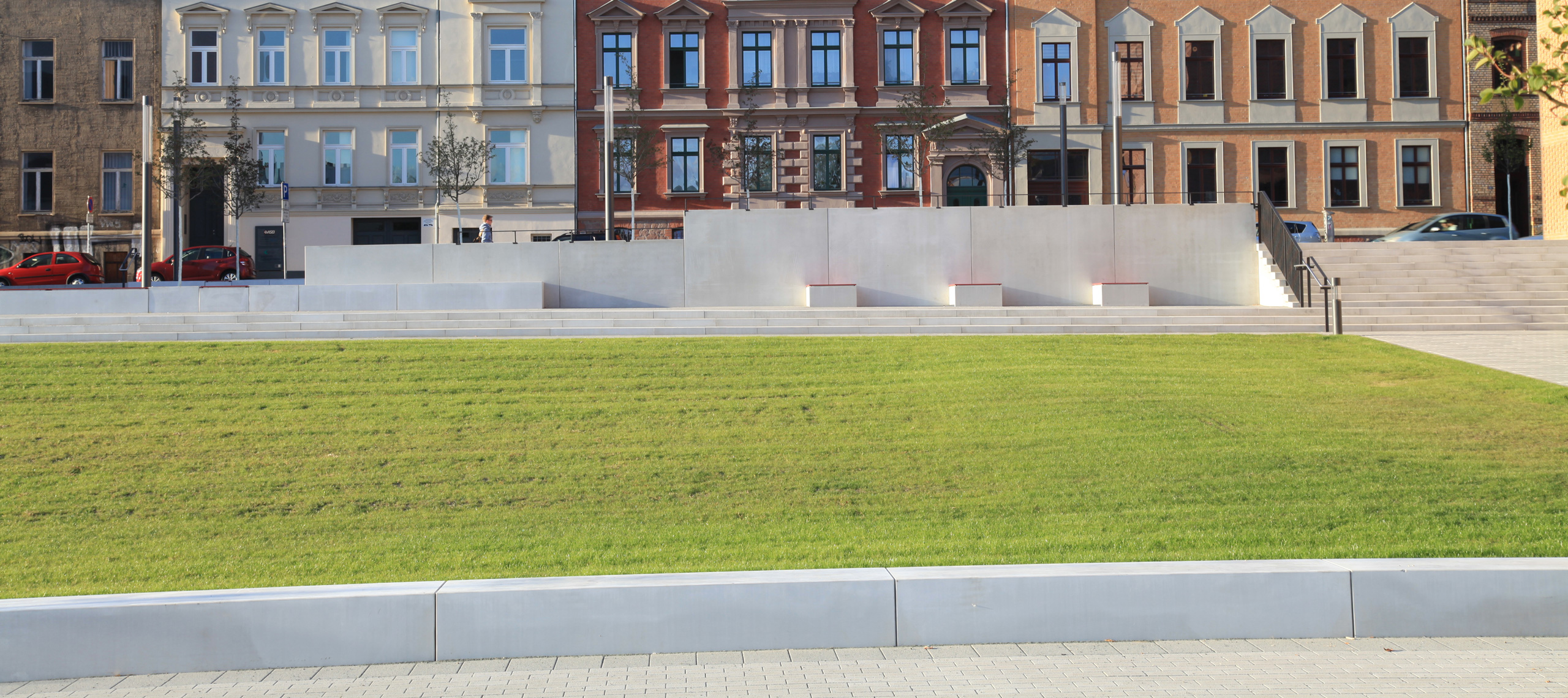Der städtebaulich bedeutendste Bereich des Campusgeländes ist der Eingangsbereich mit Bibliothek, erreichbar über die Emil-Abderhalden-Straße und die Ludwig- Wucherer-Straße. Dieser wurde aufgrund seiner Priorität als großzügige, offene Platzsituation gestaltet. Die angrenzende Freitreppe überwindet den Höhenunterschied zum Park und öffnet Parkanlage und Campus zum öffentlichen Raum. Zusammen mit der Rampenanlage als barrierefreie Verbindung ist sie die nordöstliche Haupterschließungsachse der Institute. Vor der Bibliothek entstand ein Platz unter Bäumen mit Sitzelementen. Der Bereich bildet ein offenes und großzügiges Entree zum Campus des GSZ. Großzügige Gräserpflanzungen folgen der Grundstücksgrenze zur angrenzenden Altbebauung. Frühjahrsblüher im Bereich des Parkes sind Anziehungspunkt über die Grenzen des Quartiers hinaus.